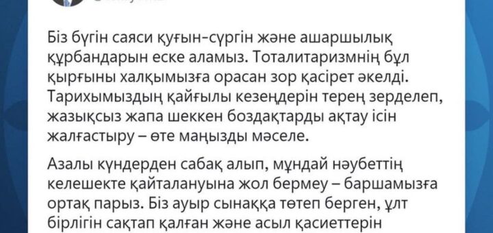 Президент 31 мамыр – Саяси қуғын-сүргін және ашаршылық құрбандарын еске алу күніне орай Twitter-де арнайы жазба жариялады – Біз бүгін саяси қуғын-сүргін және ашаршылық құрбандарын еске аламыз. Тоталитаризмнің бұл қырғыны халқымызға орасан зор қасірет...