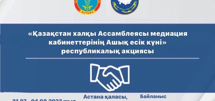 2023 жылғы 31 шілде – 4 тамыз аралығында еліміздің барлық өңірлерінде Медиация күнін мерекелеу шеңберінде (5 тамыз) Медиация апталығын және «Қазақстан халқы Ассамблеясы медиация кабинеттерінің Ашық есік күні» республикалық акциясын өткізу көзделген. Іс-шараның мақсаты...